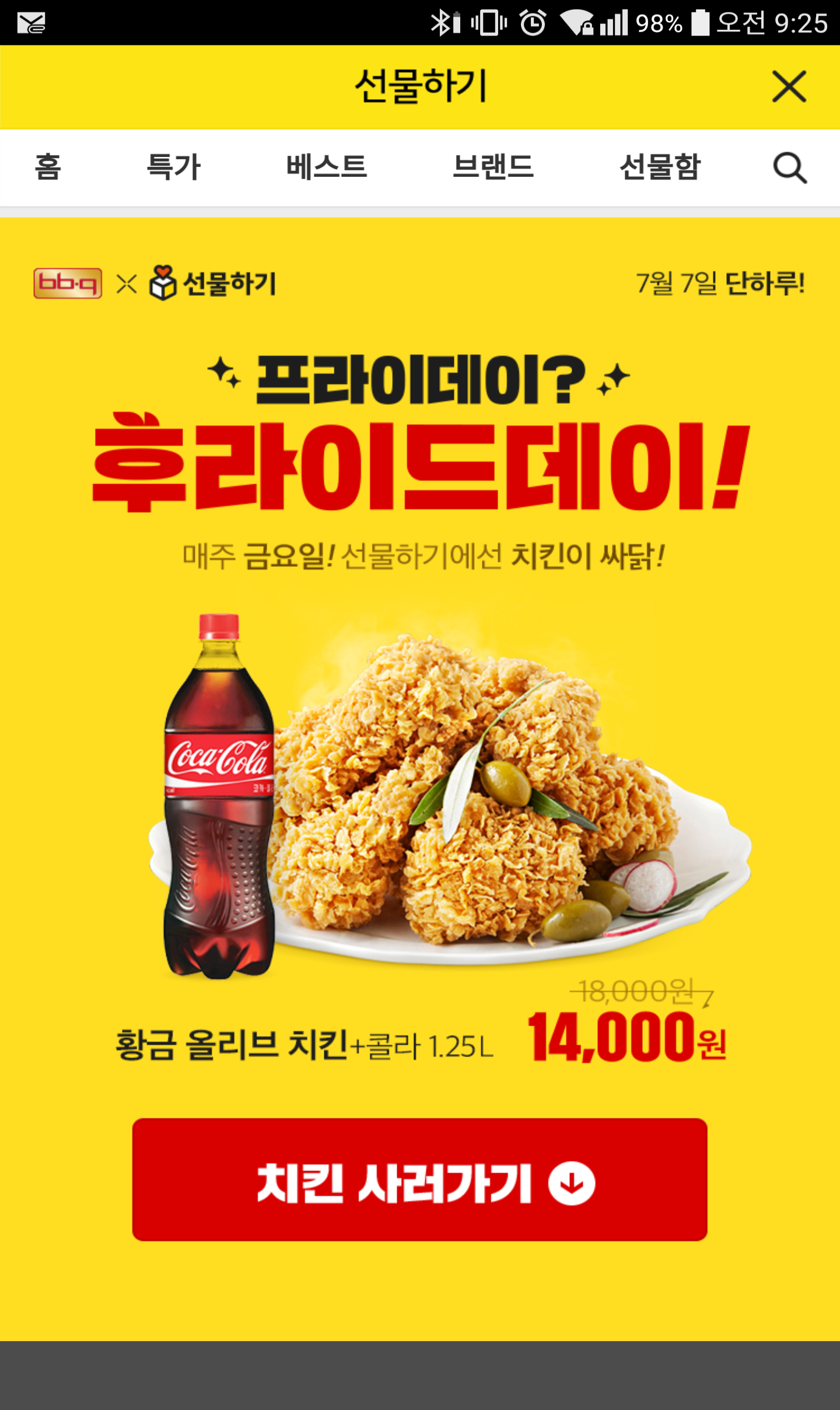 카톡 선물하기 알람이 떠서 들어가보니 할인한다고 보니 18000→14000이라고 뜨네요 전 치킨 거의 안 시켜먹어서 크게 관심은 없는데 아까 후라이드16000이라는 글을 본거 같은데 대단하네요 어차피 먹을 일 없지만요!! 콜라줘서 그런런가요?