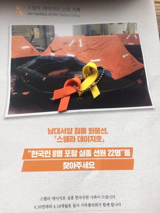 이씨가 한쪽 옆구리에 낀 비타500 상자 안엔 노란색·주황색 리본이 엇갈린 채 매달린 고리가 가득했다. 실종된 선원 22명을 찾길 바라는 가족들의 간절한 염원을 담아 구명벌 색을 가리키는 주황색으로 리본을 만들었다. 함께 달린 노란 리본은 세월호 유가족들이 이들 가족에게 보이는 연대의 의미다. 스텔라데이지호에 오른 한국인 8명을 포함한 선원 22명은 아직 생사를 알 수 없는 실종 상태다.