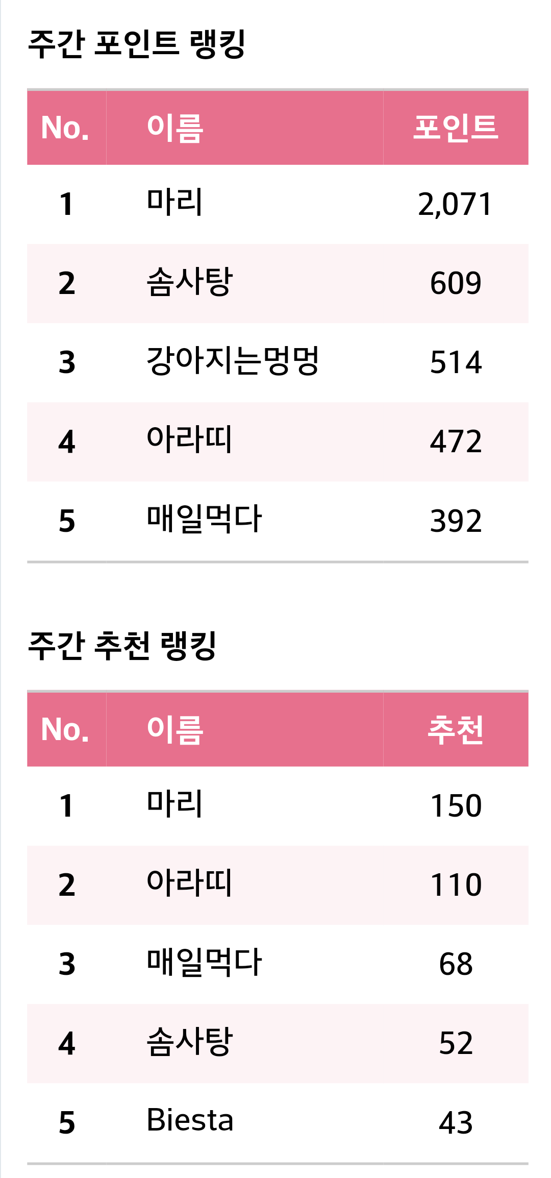 뻘글을 지르다보니 주간 추천 랭킹은 한 분도 1위한 적이 없던 것 같은데