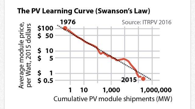 대량생산을 위한 기술의 발전 + 대량생산 + 업체들의 경쟁이 어우러 졌기 때문에 솔라 패널의 가격이 내려간거고, 이를 솔라패널의 가격이 내려간거라고 이야기한겁니다.
