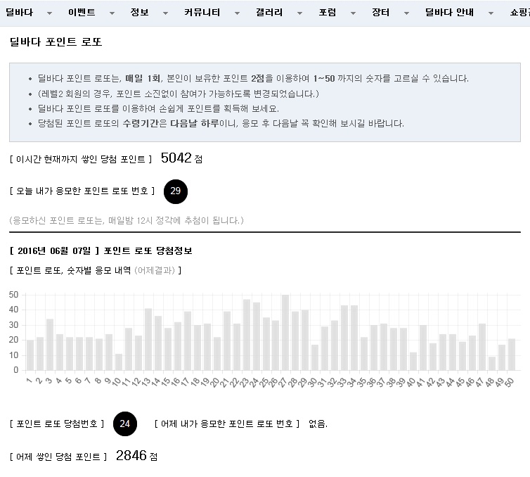 자기 포인트 2점을 내고 1-50까지 선택 후 당첨되는 1일 로또 방식으로 보입니다