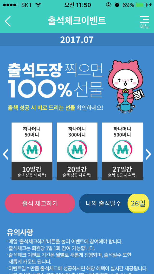전 하나멤버스랑 머니트리 같이 출첵하는데 머니트리만 하루 빠져있어서 3천원권 당첨이네요 ㅠㅠ |