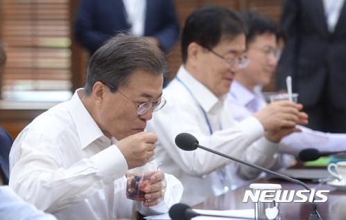 문재인 대통령이 27일 오전 수석 보좌관회의가 열린 청와대 여민관 소회의실에서 수해지역 농가의 낙과로 만든 과일화채를 맛보고 있다. 2017.07.27. amin 2@ newsis . com |