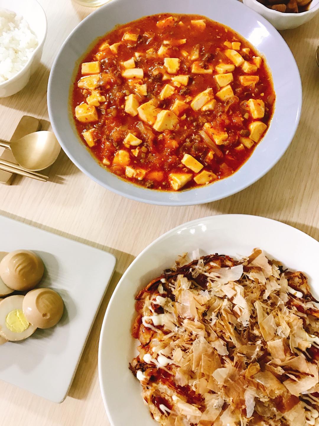연두부로 만든 마파두부 와, 오코노미야끼를 만들어봤어요.