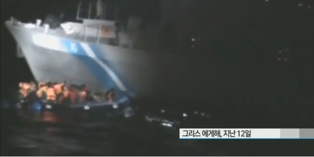 난민들은 그리스 경비정을 발견하고 도움의 손길을 요청함