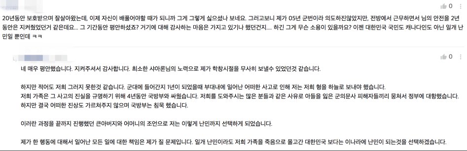 그런 사연이 있었군요...다만 난민을 신청할 노력과 시간을 생각하면 양심적 거부에 대한 병역거부가 아니라, '가족내 병역중 희생으로 인한 대체복무' 같은 사안으로 대법원까지 판결을 갔었더라면 본보기도 만들어줄 수 있고 여론의 지지도 받지 않았을까 생각해보네요... |