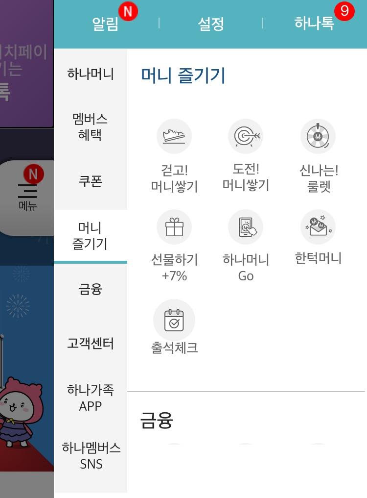 하나멤버스앱 중간 메뉴키 누르고 머니즐기기에 있어요