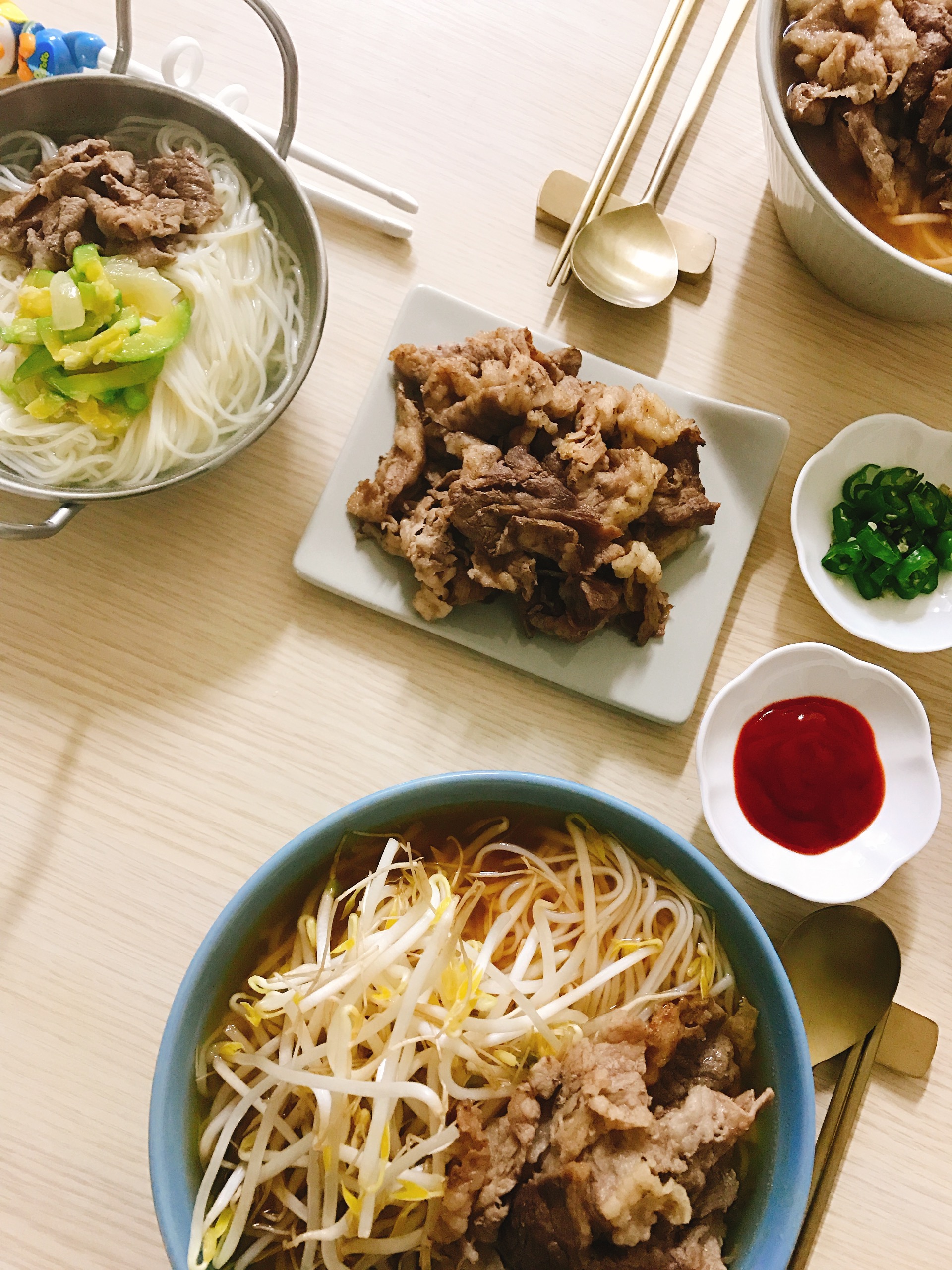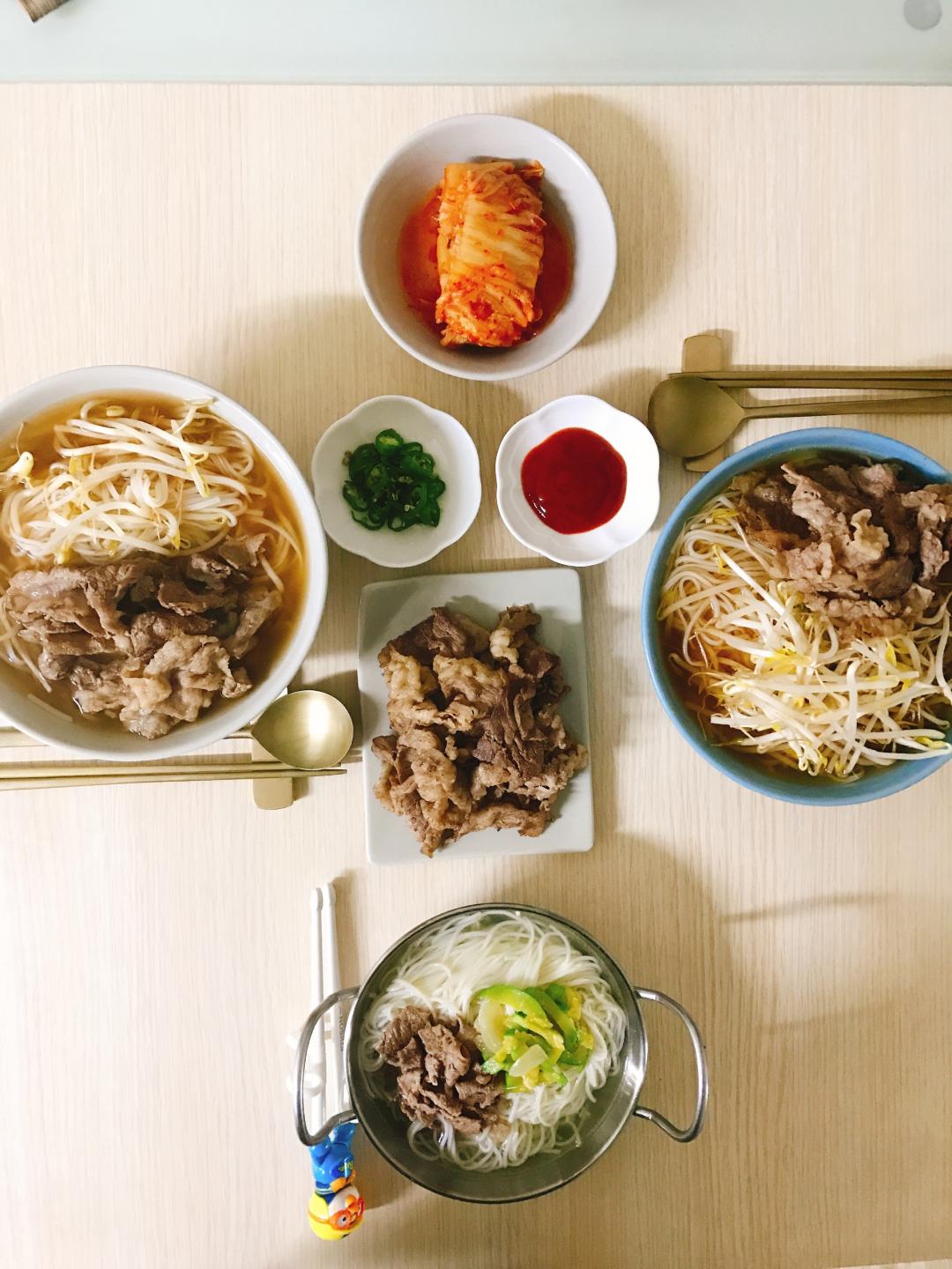 차돌박이 구워서 기름기 빼서 고명으로 올려주고, 취향껏 숙주로는 남편은 생으로, 전 살짝 익혀서 올립니다.