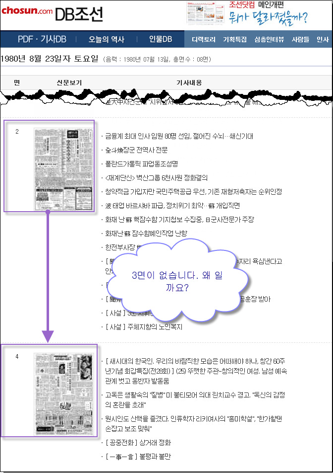 1980년 8월 23일자 좃썬일보의 아카이브 서비스를 보면 3면이 없다고 하네요. 국립중앙도서관에도 없는데 국회도서관에서 찾은 숨겨진 3면의 독재자 찬양의 모습.. 일제 시대에 일본놈들 똥꼬 빨아주던 습성(?) 하나는 죽지 않았었네요.