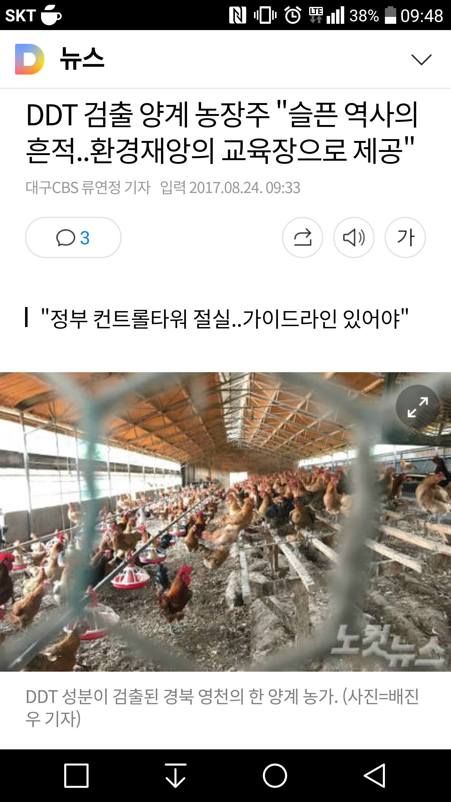 저녁 뉴스에도 짤막 인터뷰 나왔는데 방목형 닭농장이라 농약을 뿌릴 이유가 없다고 하시더라구요.