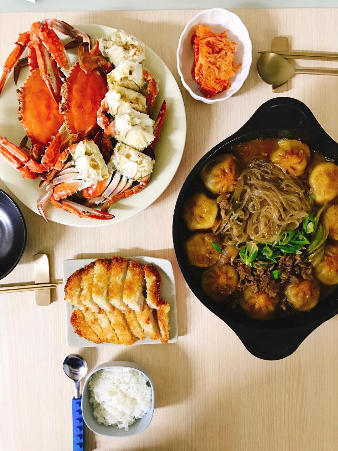 실한 꽃게로는 탕 끓이기 아까워서 찜으로 쪄내고, 꽃게도 안먹을 아이가 있어 돈까스도 구워내봅니다.