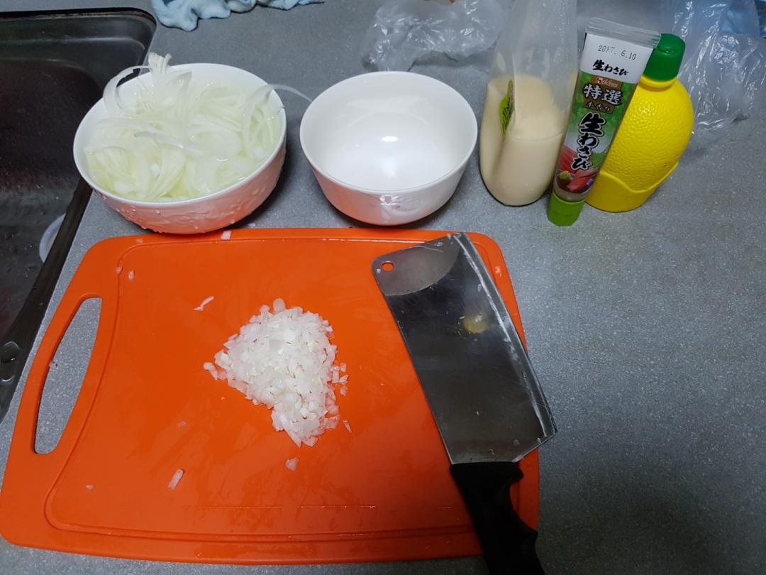 양파 다진것에 마요네스, 레몬즙(없으면 식초), 설탕, 소금 대충 넣고 휘휘 저으면 끝