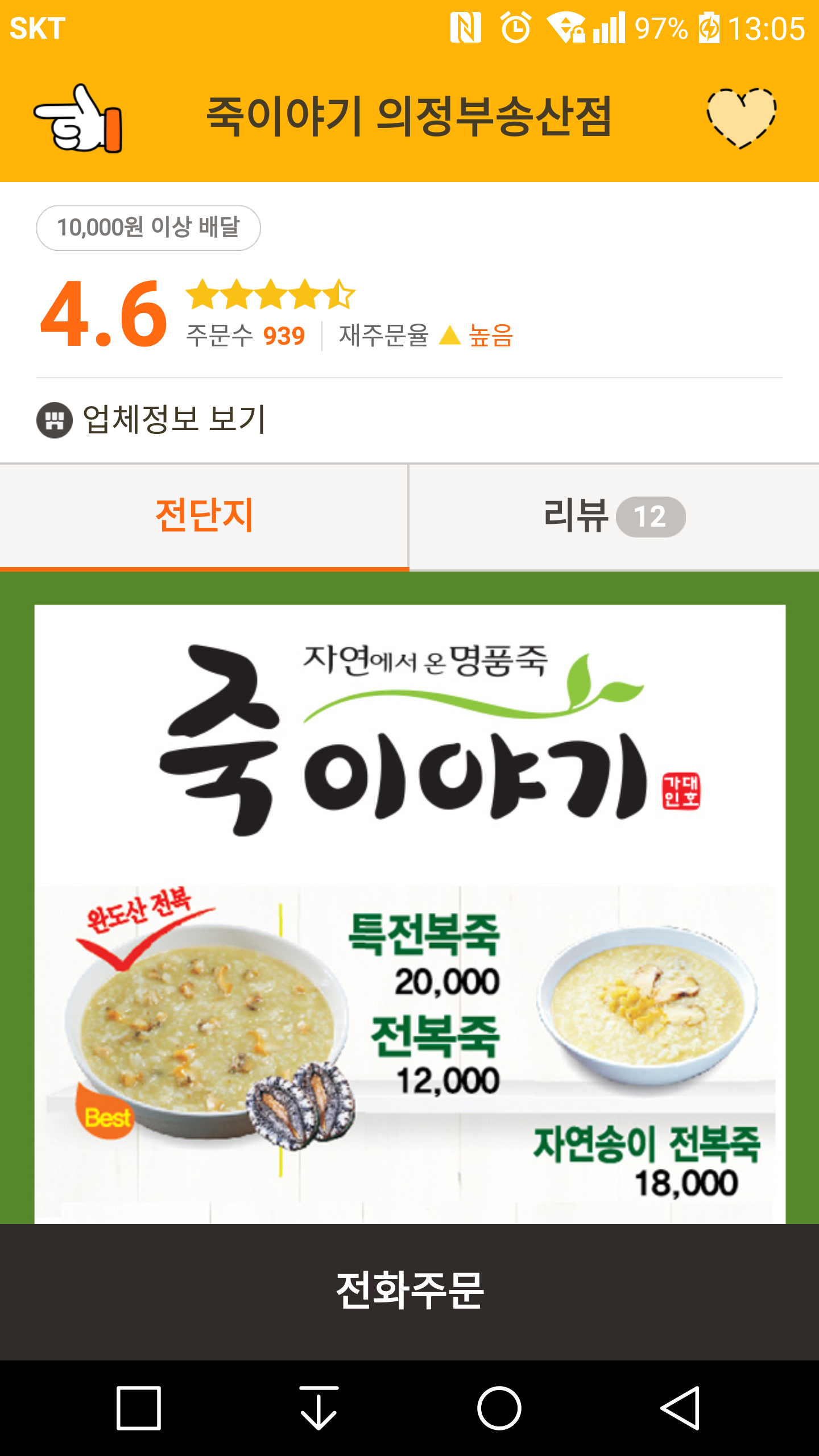오후에 아들래미 체해서 학교도 못가고 있다가 좀 내려갔나 싶어서 죽 주문을 하려고 찾아서 전화를 하니까 전복죽 특대로 2만원 짜리를 시키거나 다른 죽 2가지를 시켜야 배달이 된다고 하길래 앱에는 만원 이상으로 나온다고 했거든요..