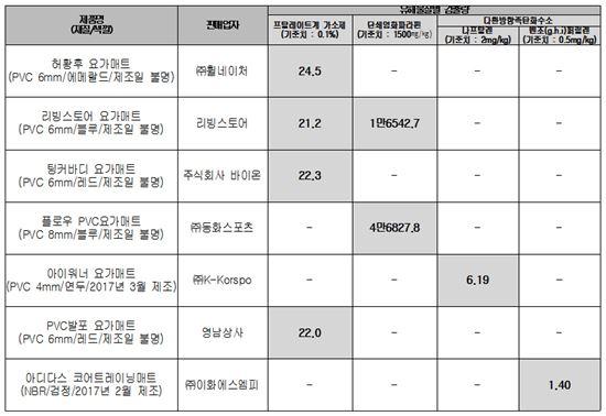 기준치를 초과하는 유해물질이 검출된 7개 제품에는 허황후 요가매트, 리빙스토어 요가매트, 팅커바디 요가매트, 플로우 PVC요가매트, 아이워너 요가매트, PVC발포 요가매트, 아디다스 코어트레이닝매트가 포함됐다.