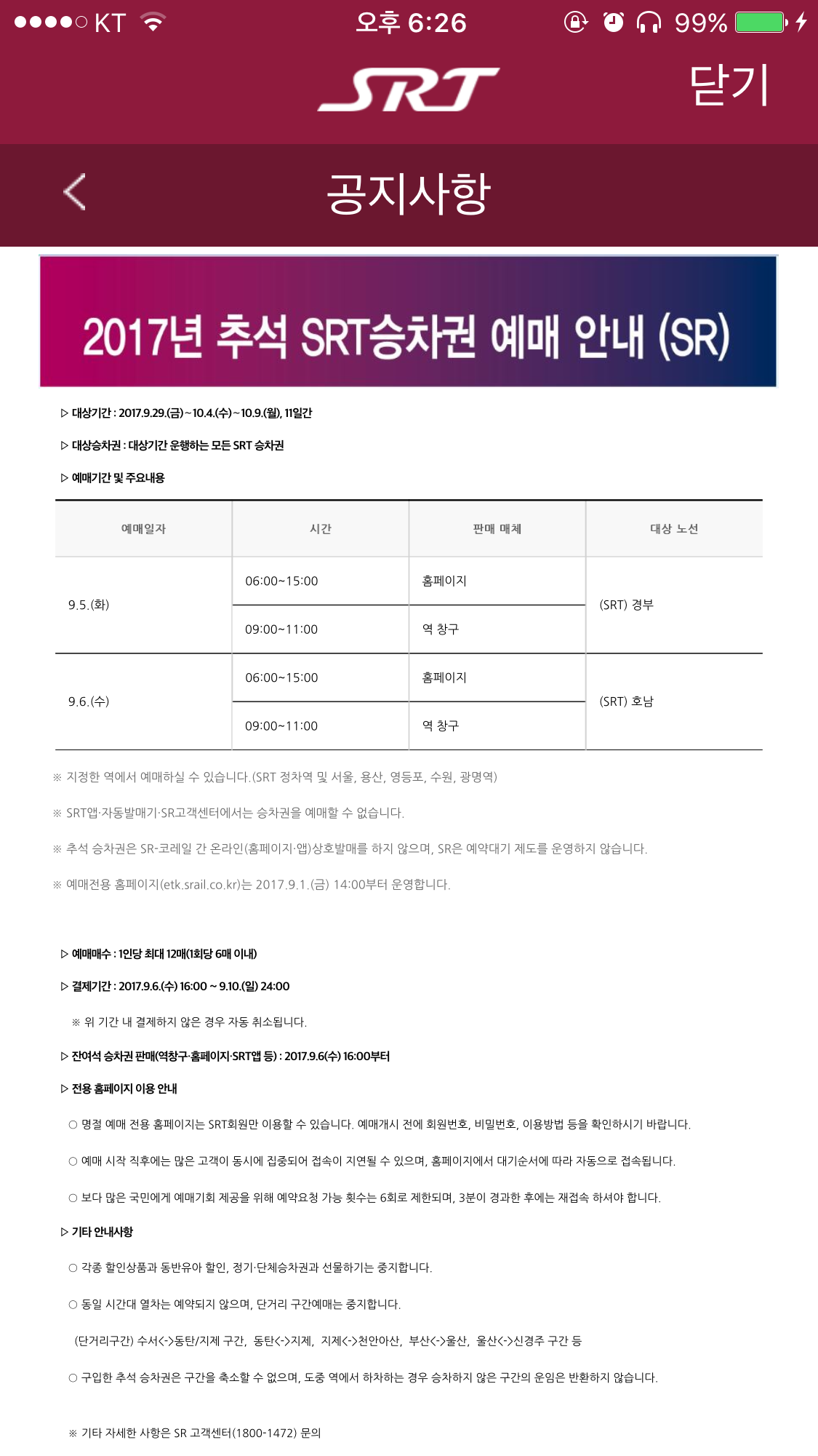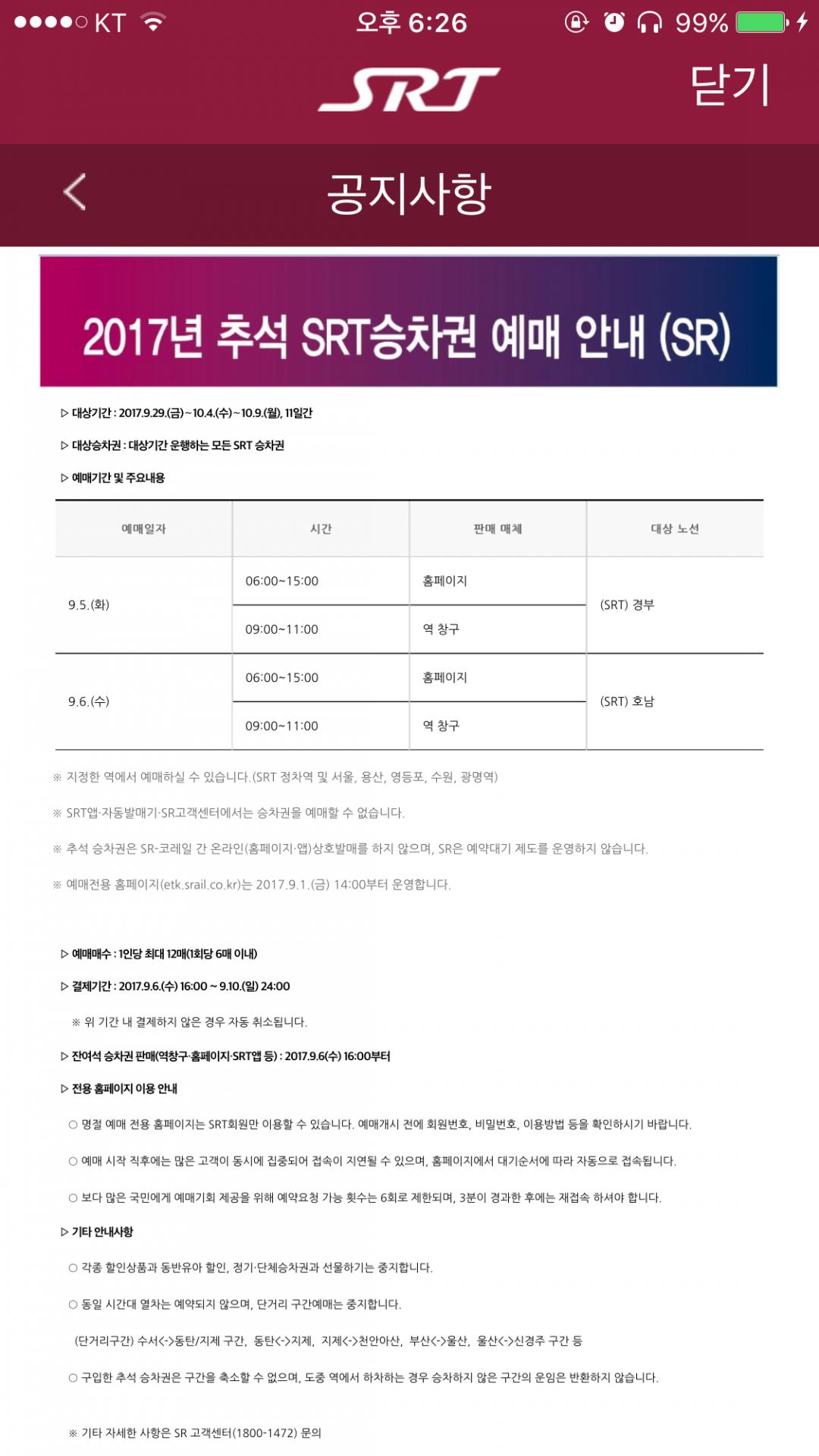 SRT 추석 예매 9/5~6일 입니다