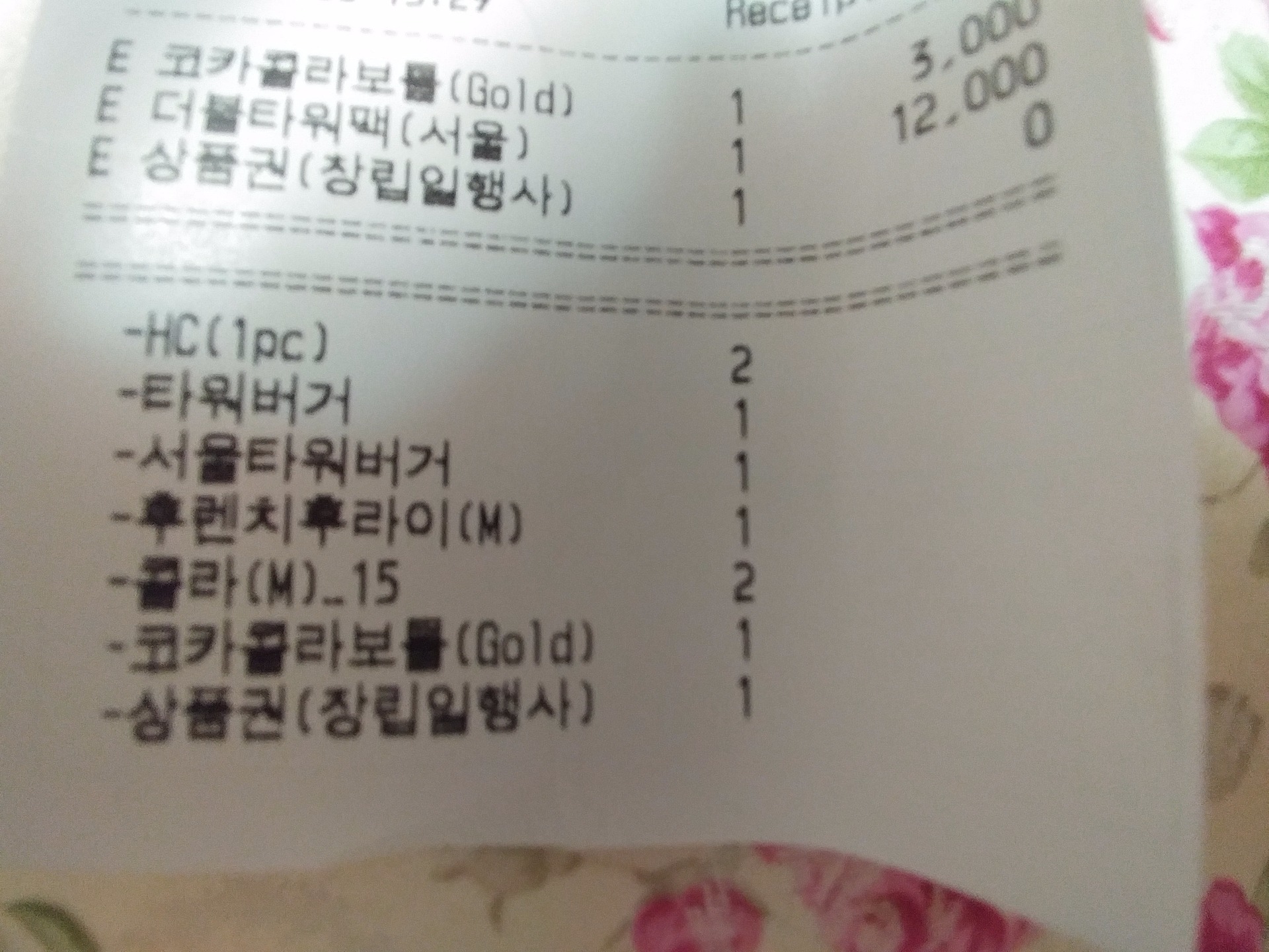 하지만 5천원 상품권 돌려받은걸 감안하면 7100원가량으로 보틀 + 햄버거 2개(타워, 서울타워) + 치킨2조각 + 감자튀김 + 콜라 2개 받았으니 만족스러운 것 같습니다.
