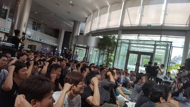 ▲전국언론노조 MBC본부가 4일 상암동 MBC 사옥 1층 로비에서 총파업 출정식을 개최하고 있다.