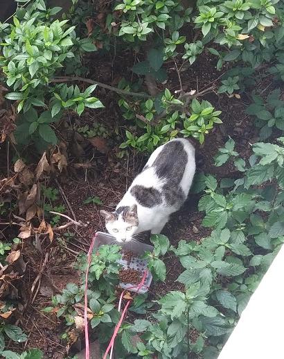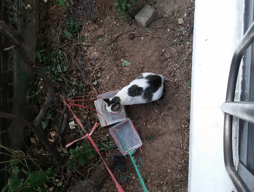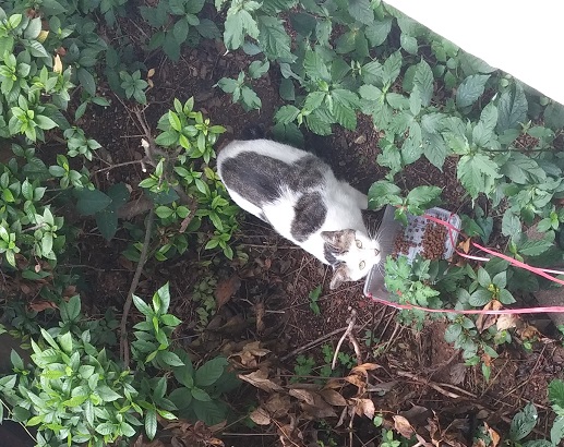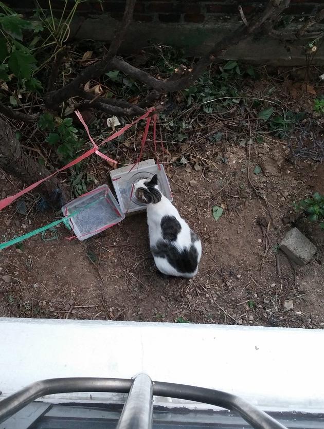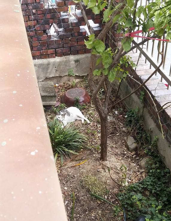 화단 빈 곳에 누워서 자고 있거나 아니면 안보이는 베란다 밑에 있다가 밥내려주면 실와서 먹고 다시 쉬어요.ㅋㅋ