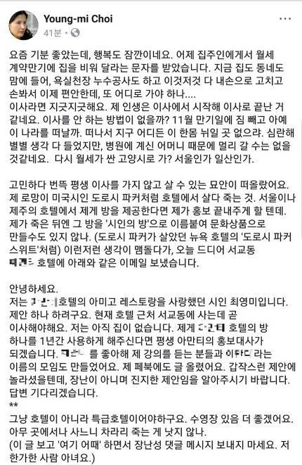 이거 해명글도 나왔어요. 호텔에서 프리로 이용할거냐, 디스카운트 받고싶은거냐 물어보니까 원래 공짜로 쓰고 싶었는데 인터넷에서 하도 뭐라해서 상징적인 액수 정도는 지불하려고 했다함. 덧붙이면서 원래 호텔에서 시낭송이라도 하려고 했다. 그 정도면 값은 충분히 치르는거니 무료로 쓰는 것도 아니다.