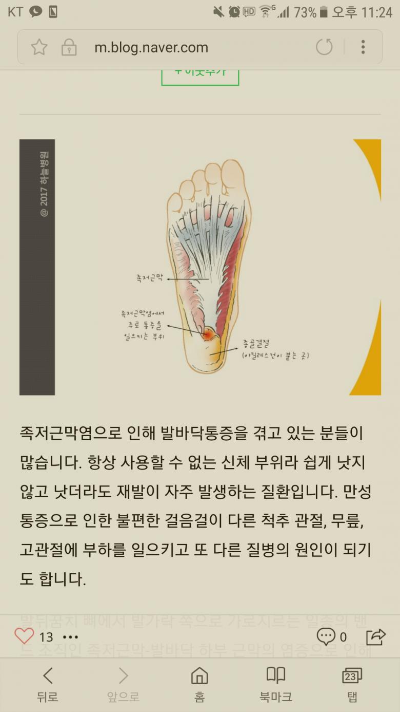 족저근막염인가 저도 의심이 되네요 ㅎㅎ근데 막 심한 상태는 아니라 좀 주물러 주고 찜질 해지면 풀리기도 하더라구요. 관리 잘해야겠네요 ㅠㅠ |