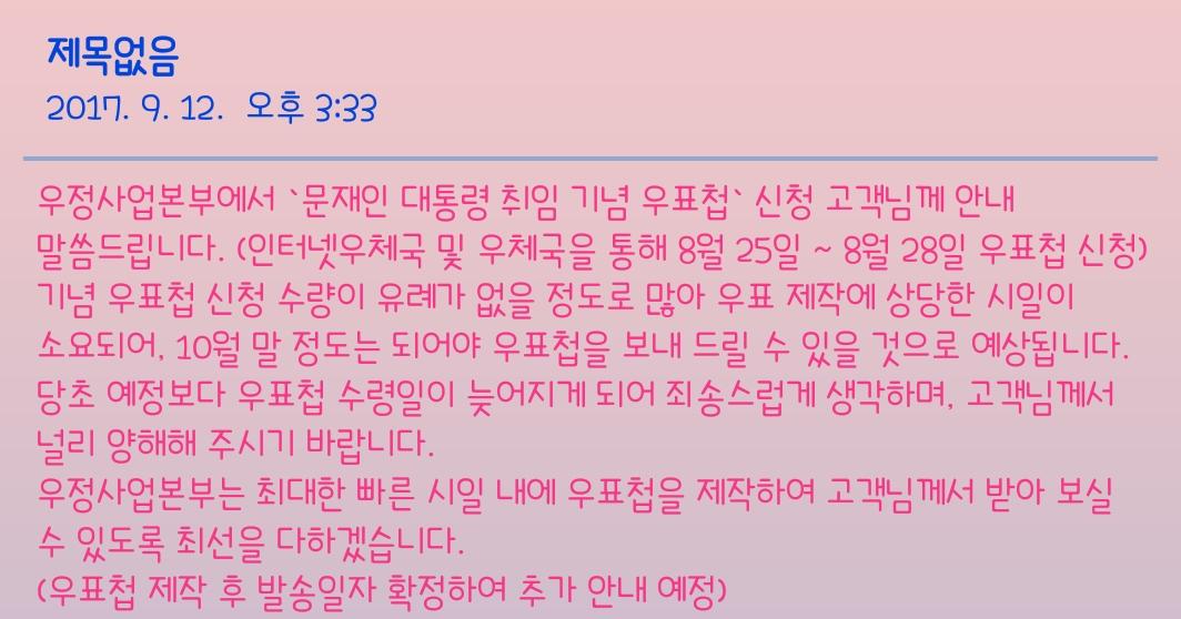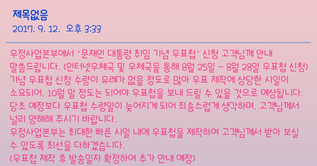 방금 같은 문자 받았습니다. 20년만에 사보는 기념우표인데 1달쯤 더 기다리는 거 문제 없습나다. ㅋ |