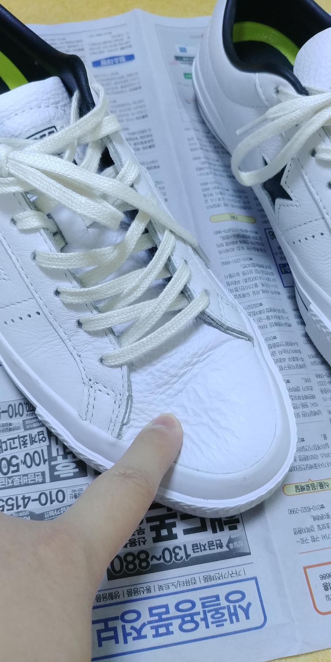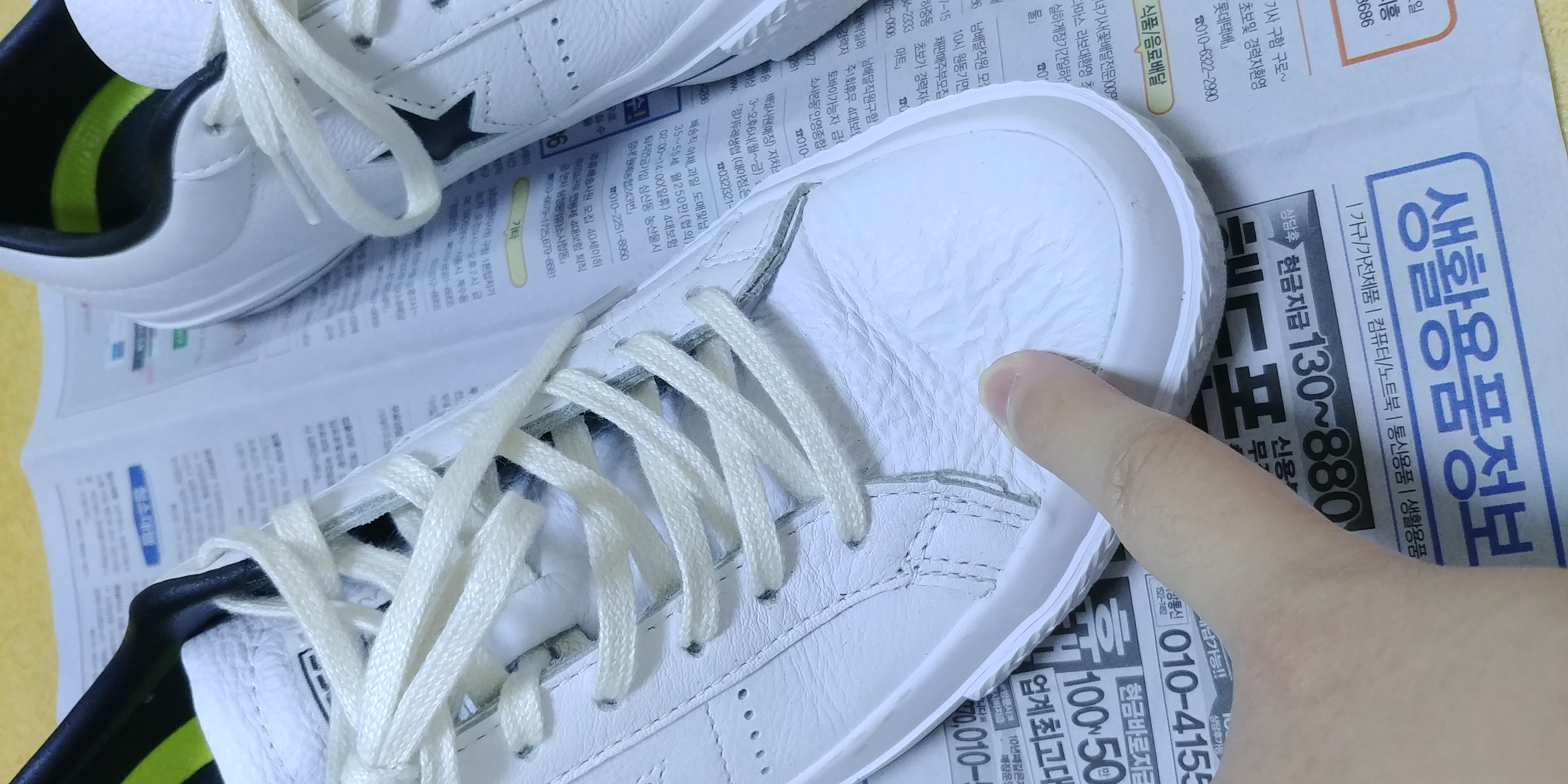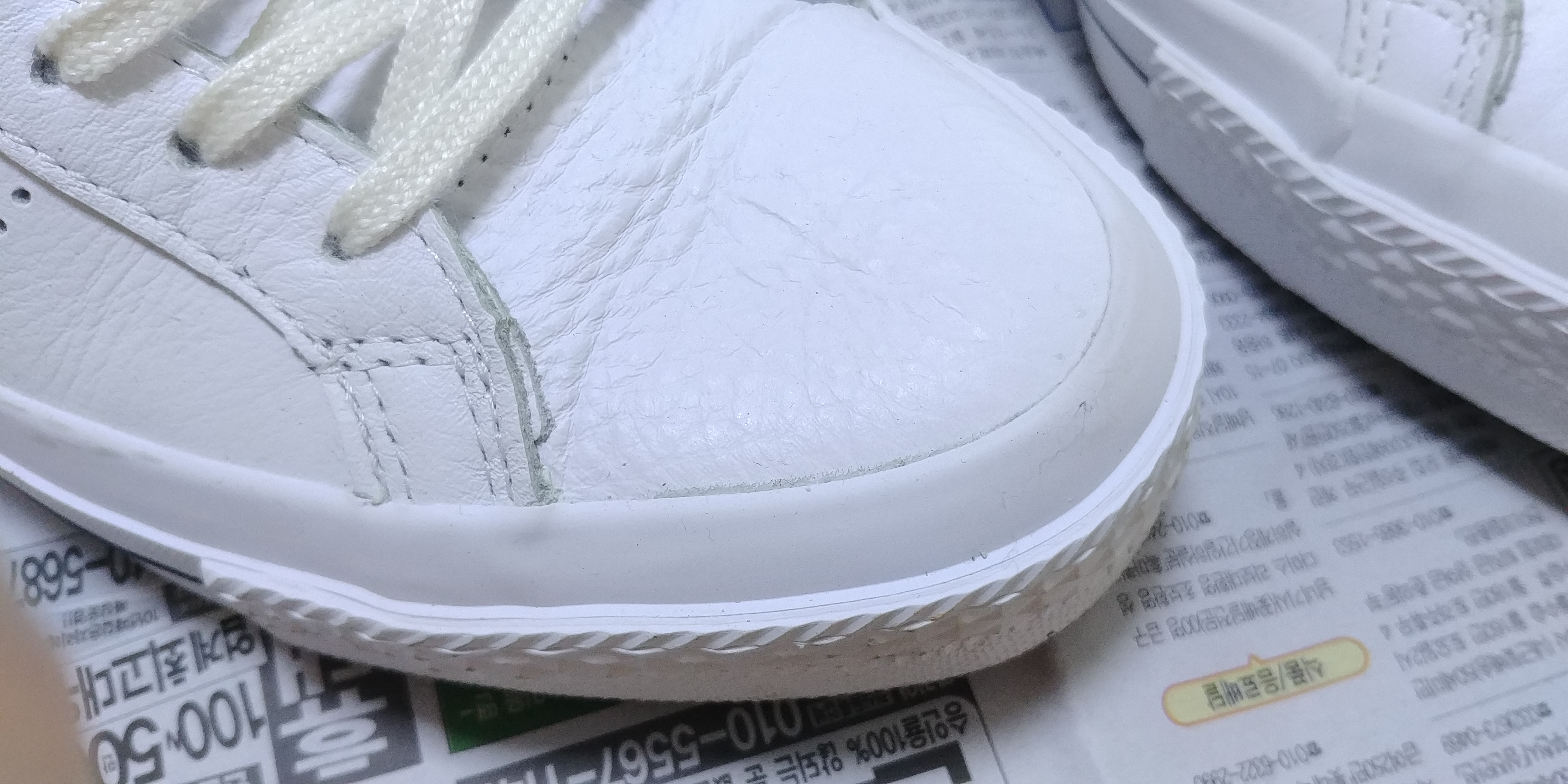 신었을때 한쪽만 심하게 쭈글쭈글하고, 앞코 모서리가 까지네요.