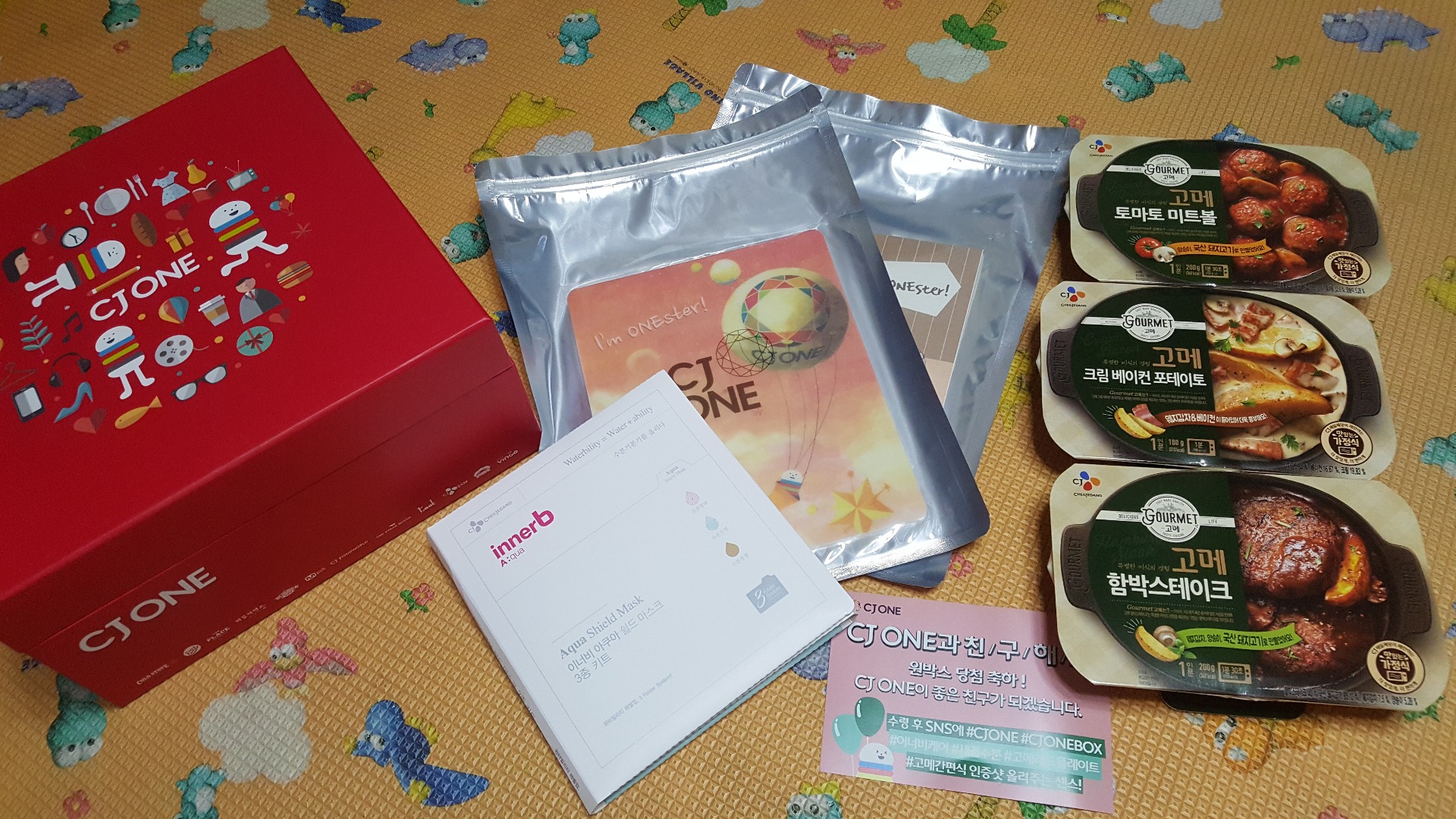 구성품은 즉석식품3개, 마스크팩3개, 노트1권, 마우스패드 1개...이렇게 구성되었습니다.