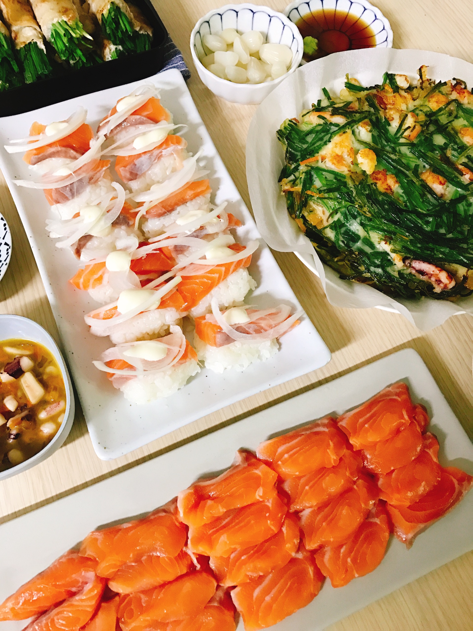신선한 연어 배송 받아서, 양파는 아주 얇게 채썰어, 찬물에 담가 매운기 잡아서 , 초밥으로 만들어 내고, 나머진 사시미로.
