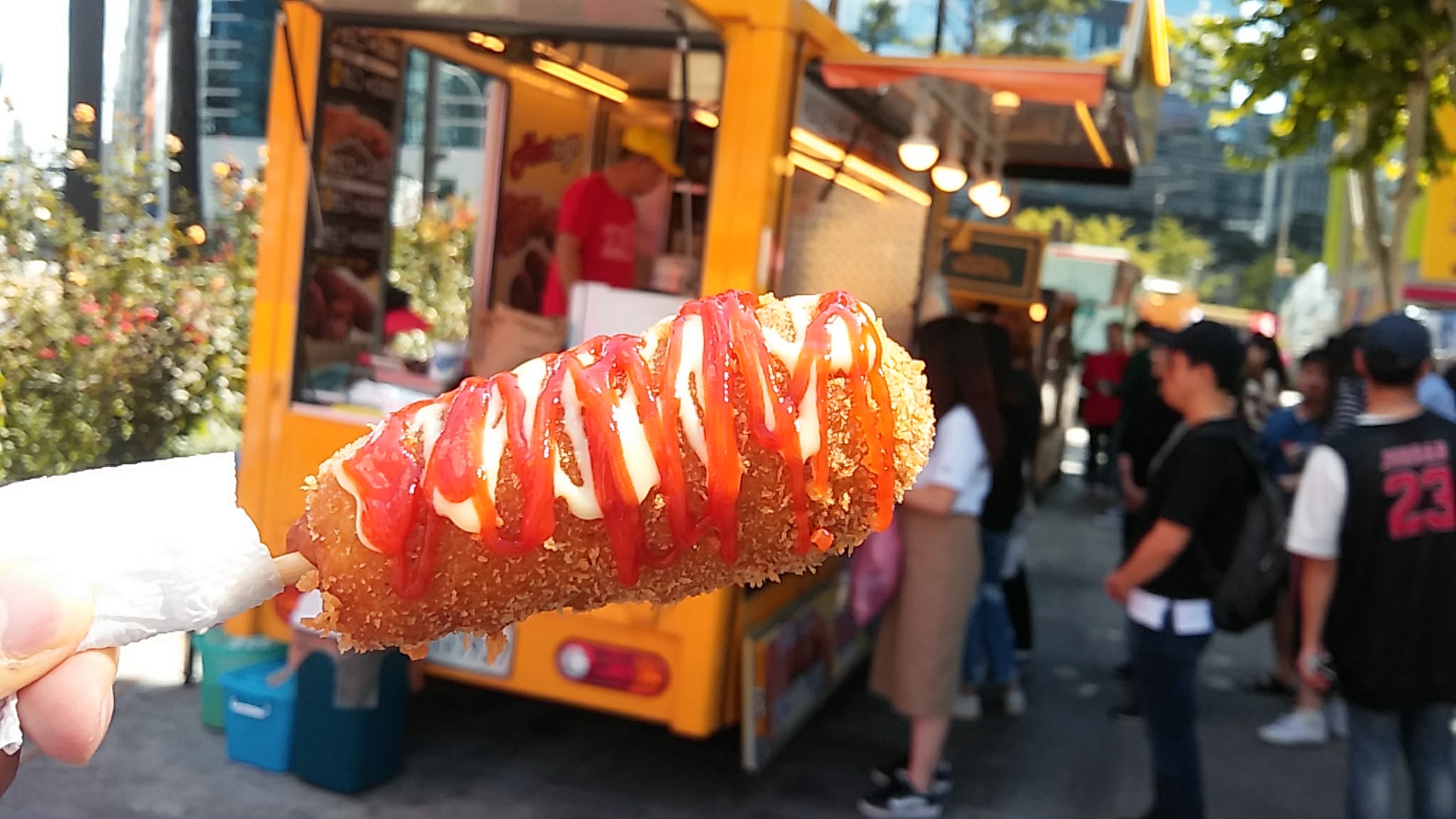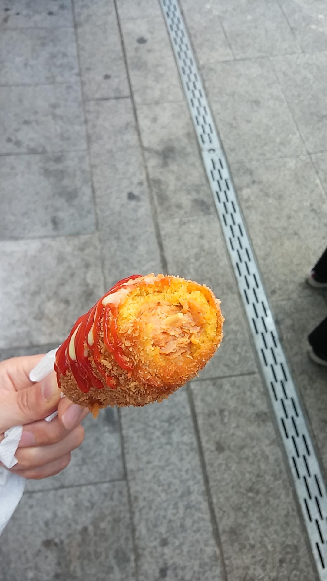 방송보며 불고기집과 핫도그집을 먹어보고 싶었는데 핫도그집은 영업중이라 다행입니다. 다른집보다 유독 핫도그집에 사람이 붐벼 십분가량 줄서야 구입할 수 있었습니다. 저처럼 커리+고추맛이 궁금한 사람이 많았나봅니다.