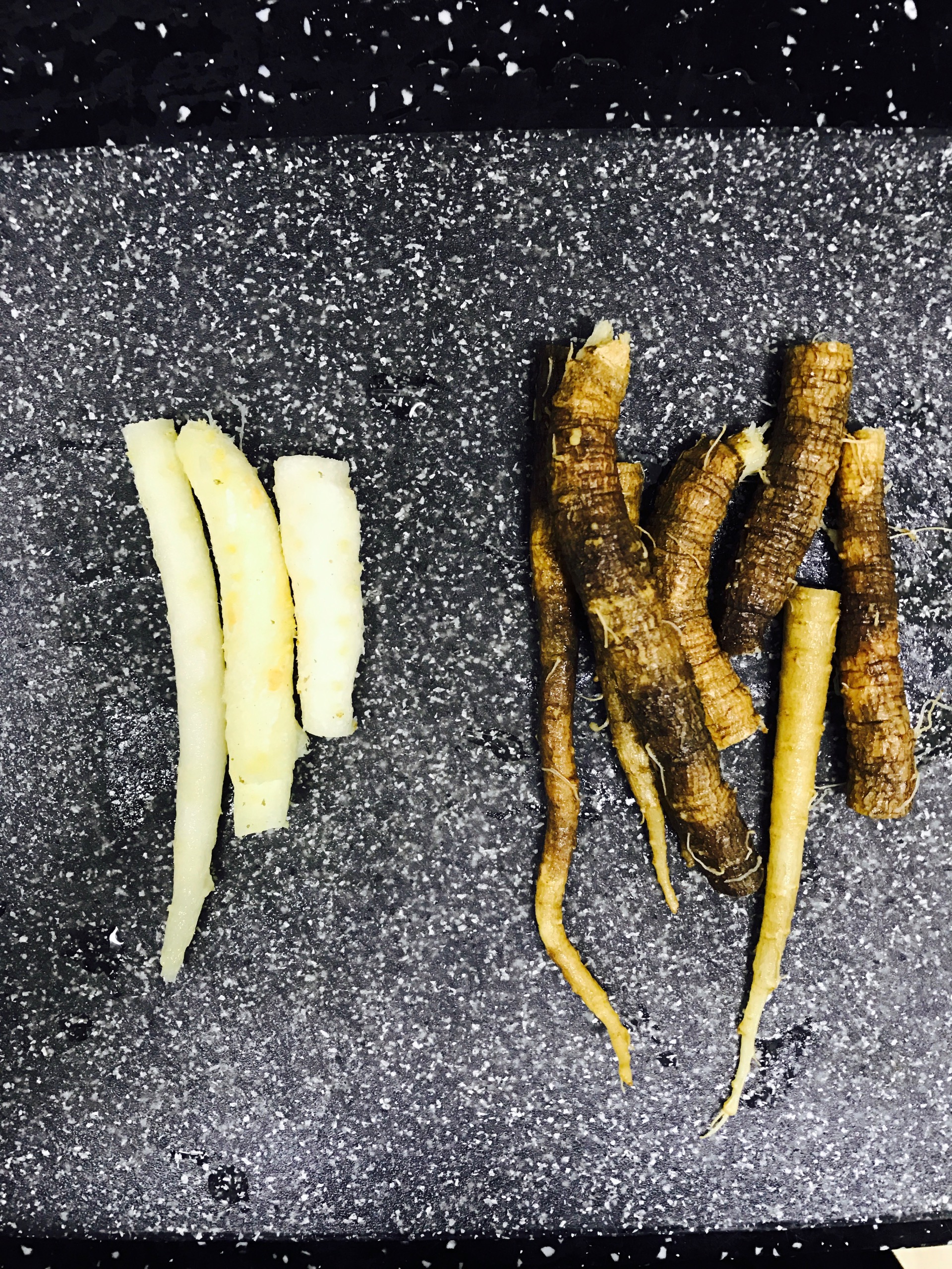 더덕손질은, 깨끗하게 씻은 더덕을 끓는물에 10초만 데쳐내서 벗겨주시면, 힘 들이지 않고 껍질 깨끗하게 벗길수 있어요.