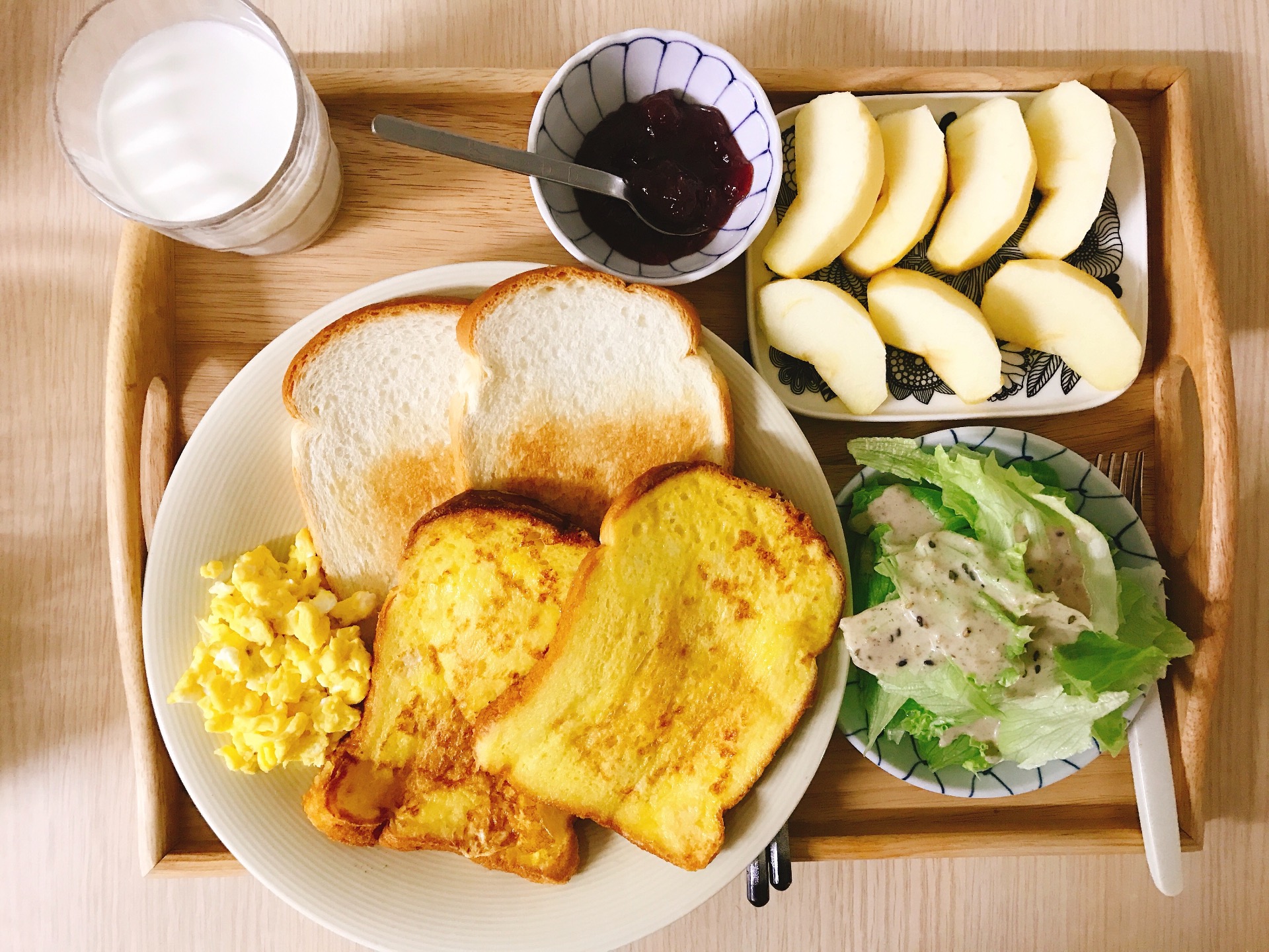 아이는 토스트빵을 좋아해서, 바삭하게 구워서 잼 준비해주고, 전 프렌치를 좋아해서 달걀물 입혀줬어요.