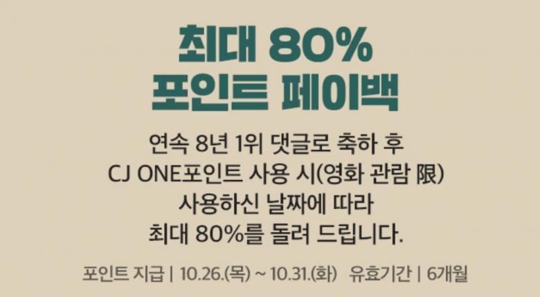해당날짜에 cgv에서 cj one포인트를 쓰면 80% 페이백입니다 온오프 무관이요