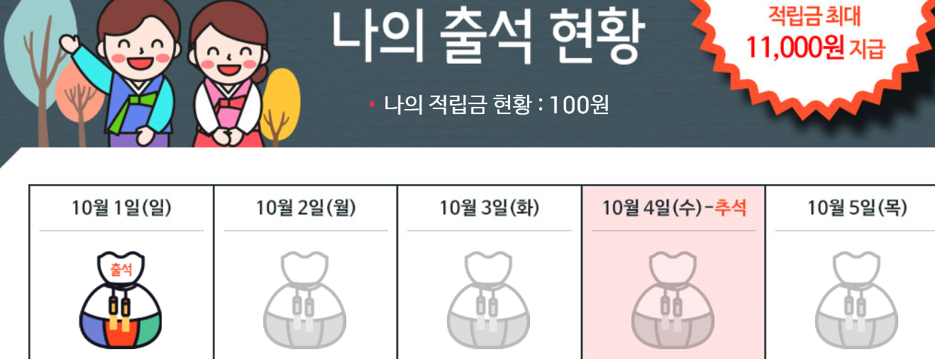 하루도 빠짐없이 해야지 적립금 11000 포인트 들어온다고 합니다 (10월 13일 지급 10일안에 사용하셔야 됩니다.)