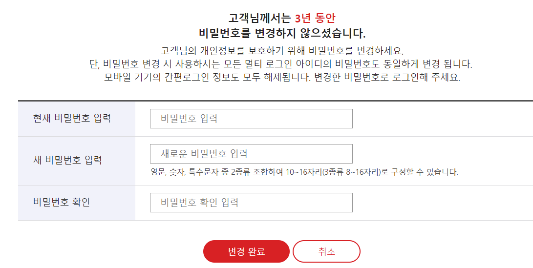 매번 비밀번호 바꾸라고 뜨고 나중에 가서 로그인할려고 하면 까먹고... 비밀번호 찾기로 본인인증 또 해야되고..ㅠ 악순환입니다. | ||