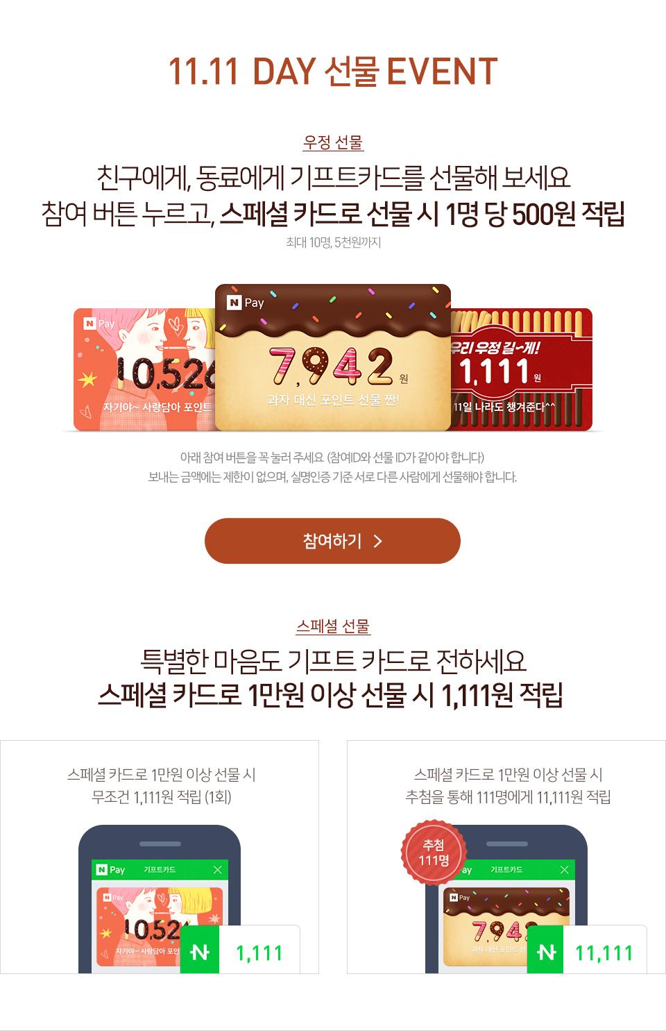 - - 스페셜 카드로 1만원 이상 선물시 1회 무조건 1,111원 적립되고 추첨을 통해 111명에게 11,111원이 적립됩니다.