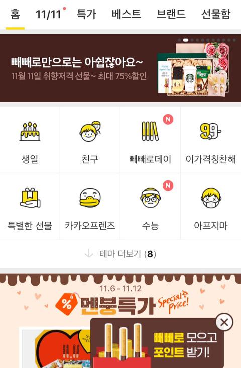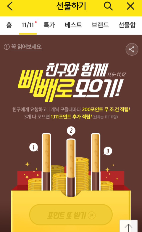 카톡 > 선물하기 > 우측하단 '빼빼로 모으고 포인트받기' > 응모후 친구3명에게 빼빼로를 받으면