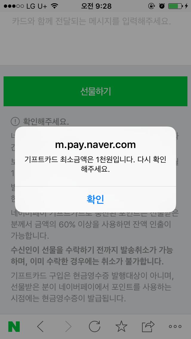 이거 해보진않아서 확실히는 모르겠지만 그 네이버페이 카드선물하기는 천원이상만 선물하기가 가능합니다 |