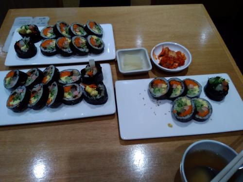 이윽코 마지막 한접시가 나옵니다. 제 테이블에 이미 두접시가 올라가 있는것 보며 서빙 하시는분이 바른김밥 한줄 주문한데가 어디냐고 카운터에 물어보더군요 곧 제자리로 세번째 접시가 놓여집니다. 민망해서 서빙하는분 보고 웃으니 여긴 한줄씩 준다고 하시더군요