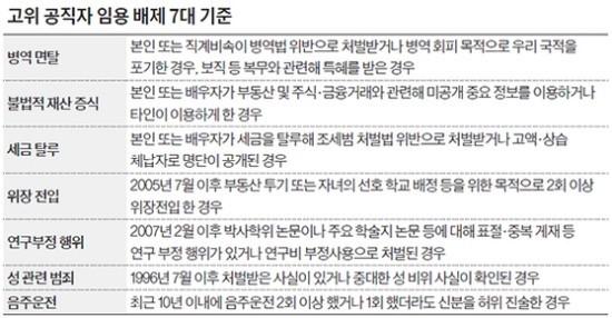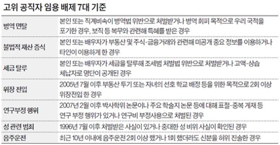 7. 청와대, 고위 공직자인사 검증 7대 기준 공개 → 일부 항목 적용 시점 정해. 위장 전입 2005년, 논문 표절은 2007년, 성범죄 1996년, 음주운전 최근 10년...(중앙 외)▼