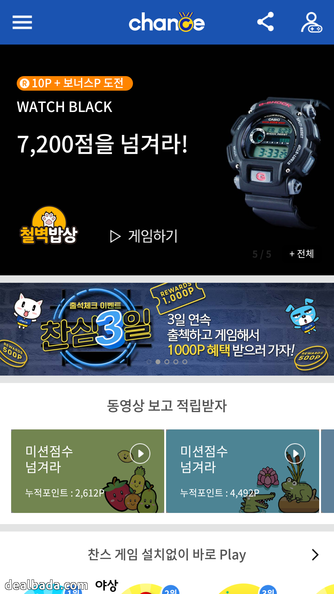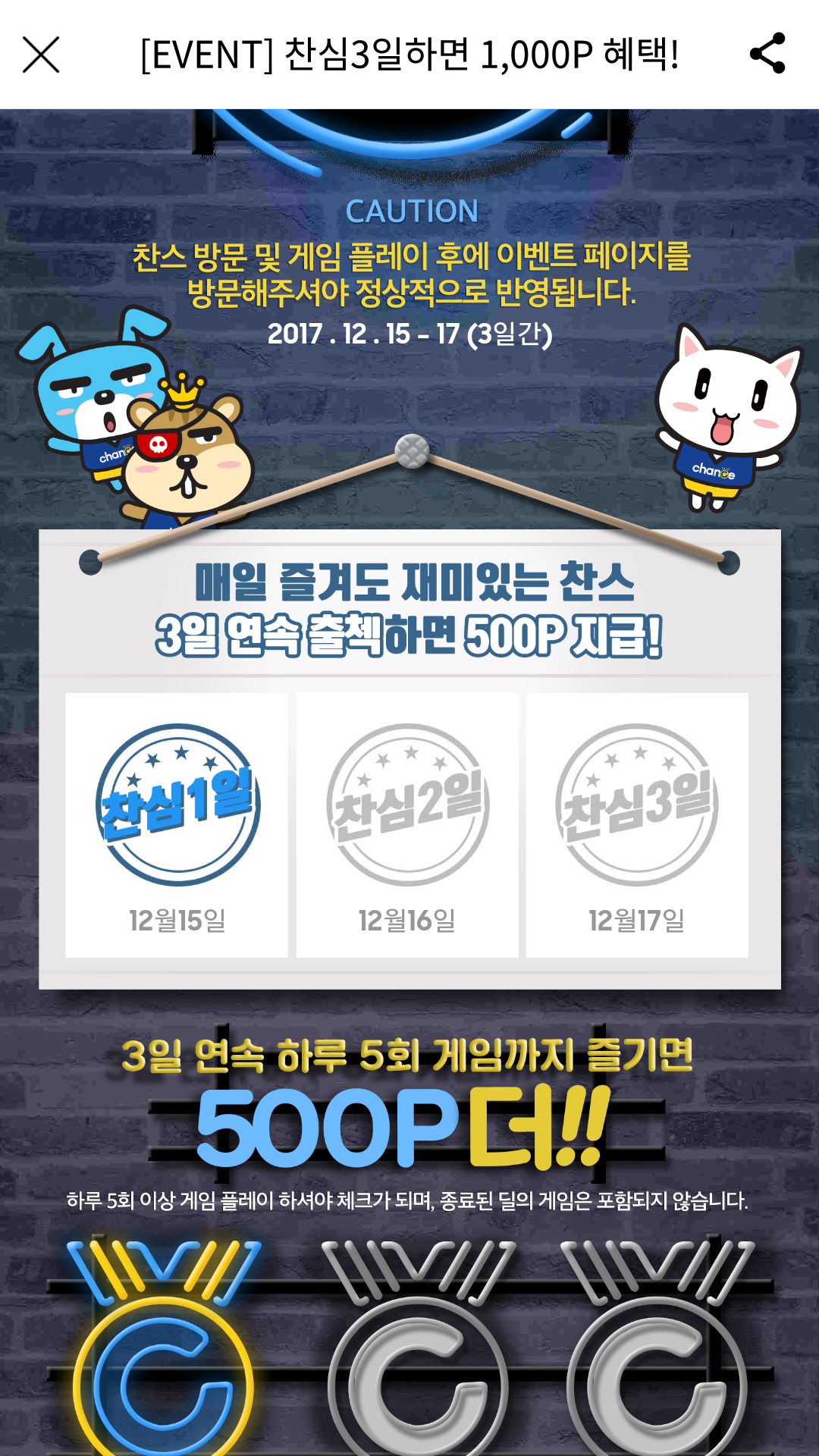 하루에 게임5회하고 이벤트 페이지 방문 3일 하면 500포인트 추가로 줍니다.