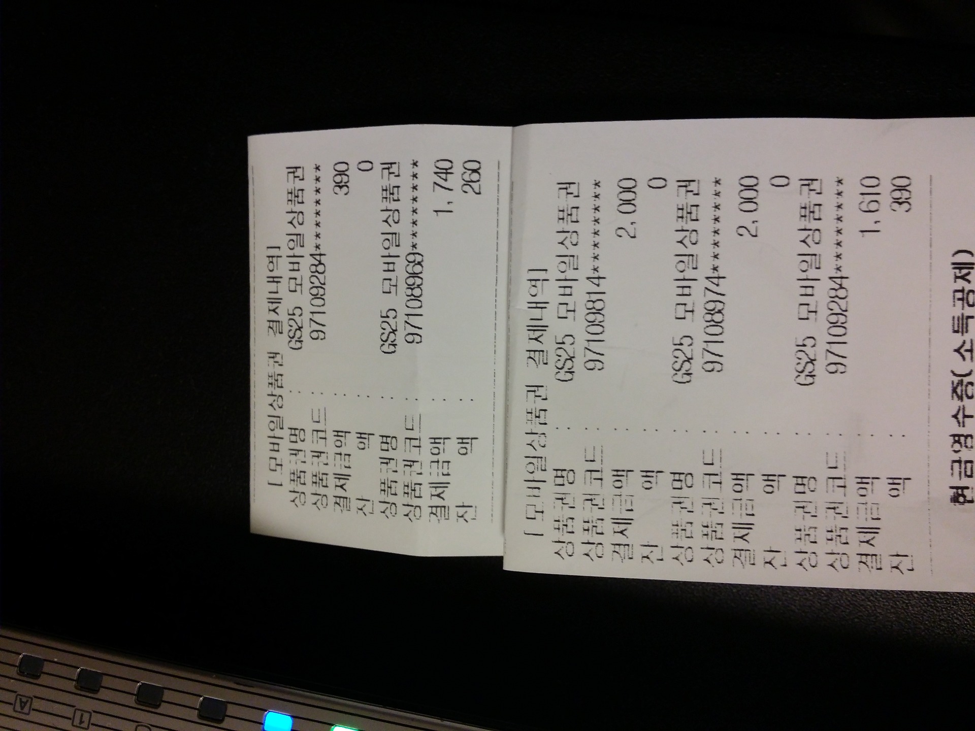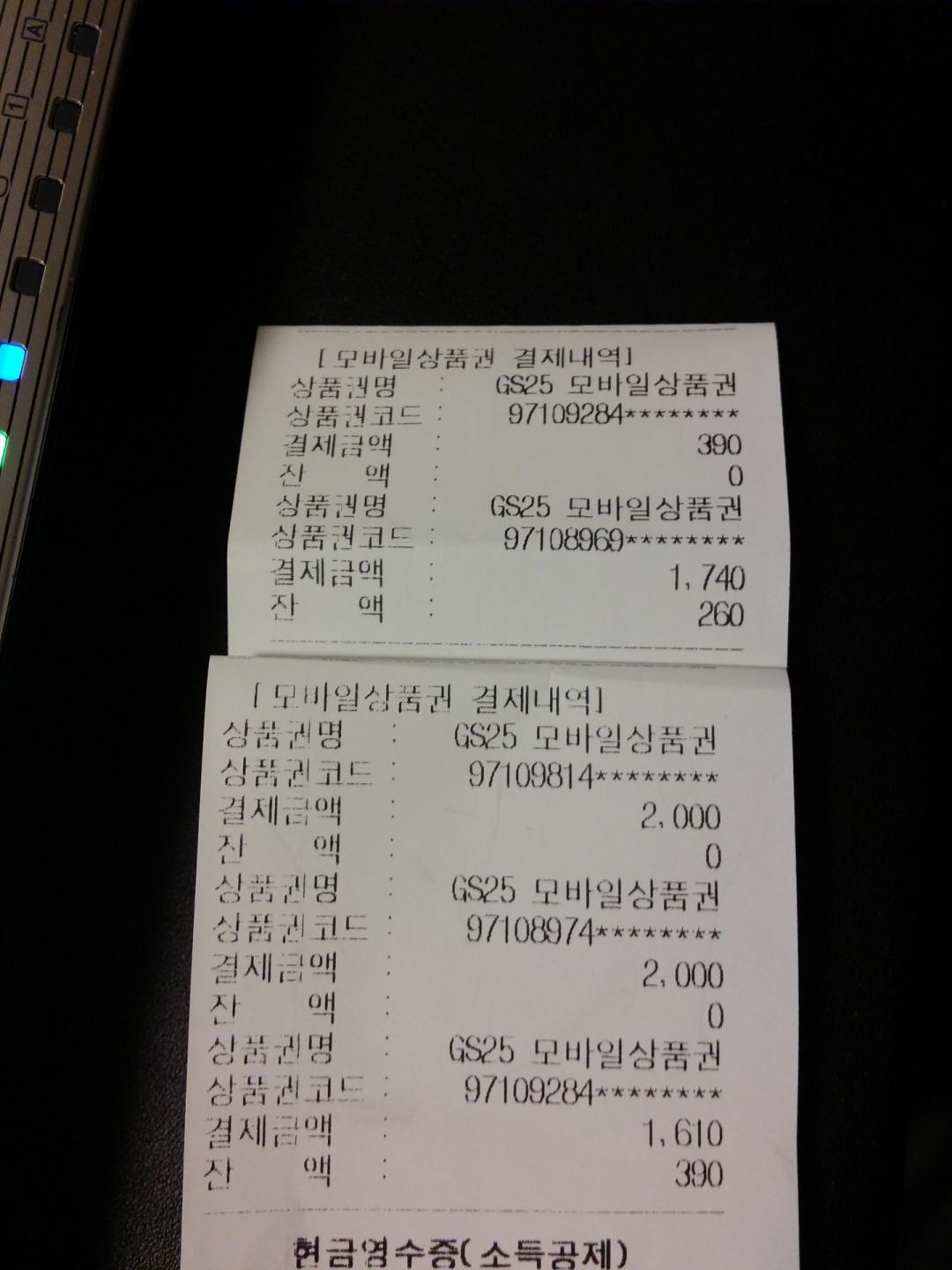 한달전에 클립이벤트인가?로 받아둔 지에스상품권으로~~~ 선불폰 덕분에 총4장 8천원어치 ㅎㅎㅎ