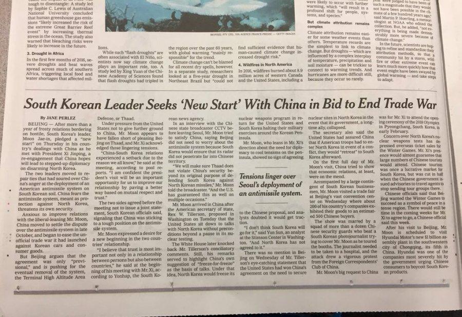 2. 뉴욕 타임즈 : 한국의 지도자 중국과의 무역전쟁 종식과 새로운 시작을 모색하다.