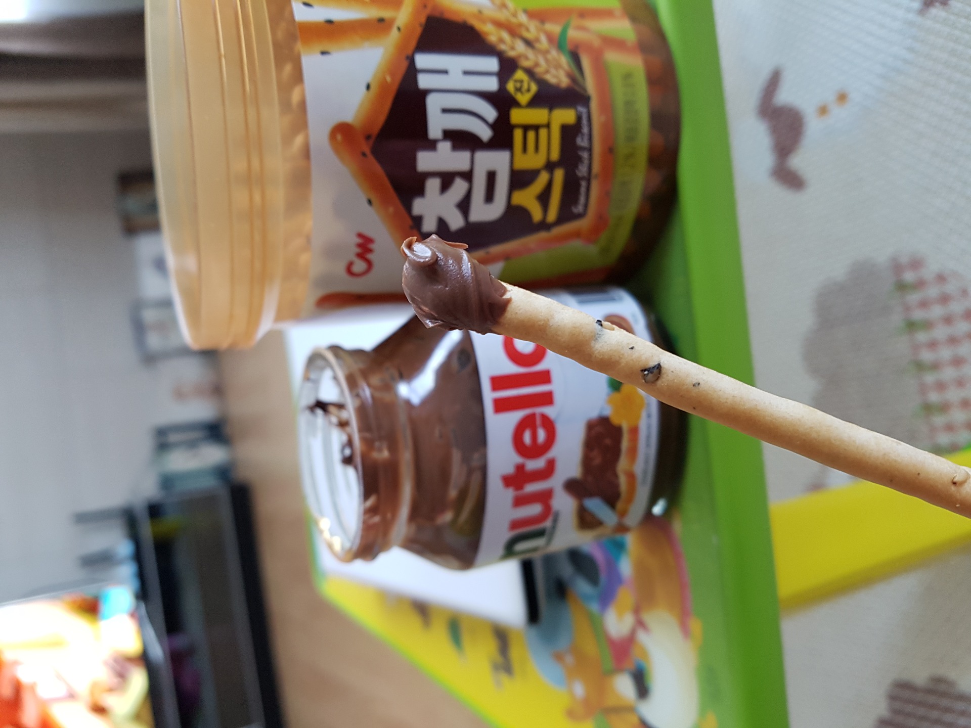 누텔라에 참깨스틱을 찍어 먹어보니 매우 맛나네요.누텔라의 달달한 초코맛과 참깨스틱의 고소함이