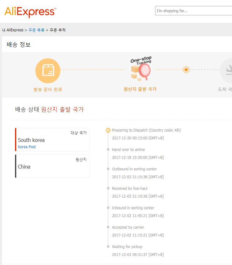 전 Departed country of origin / 2017-12-01 23:59:59 [GMT+8] ㅜㅜ 알리에서 첫 주문인데  오래걸려도 온다고 해서 기다리고 있는데 디스풋 기한이 4일정도밖에 안남아서 문의해야되나 고민이네요