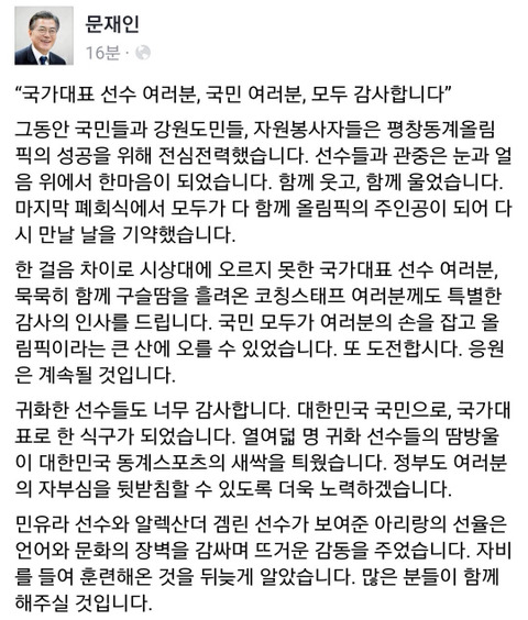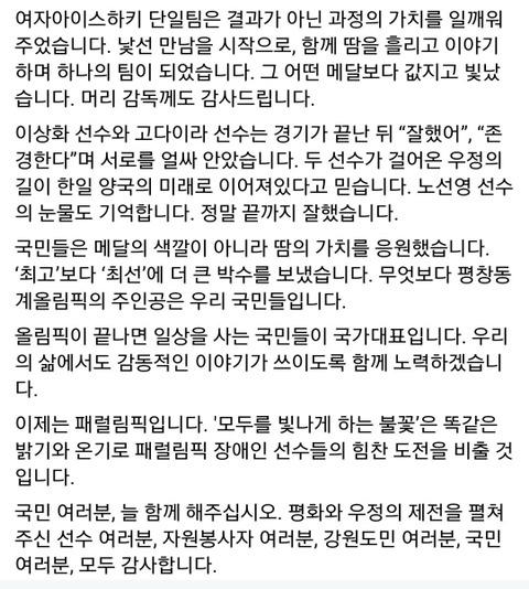 저런 소감문들은 전부 보자관들이 써준것이 아닌가요? 저도 문재인 대통령님을 좋아하지만 정치인이라 완전히 신뢰하진 않습니다. | ||