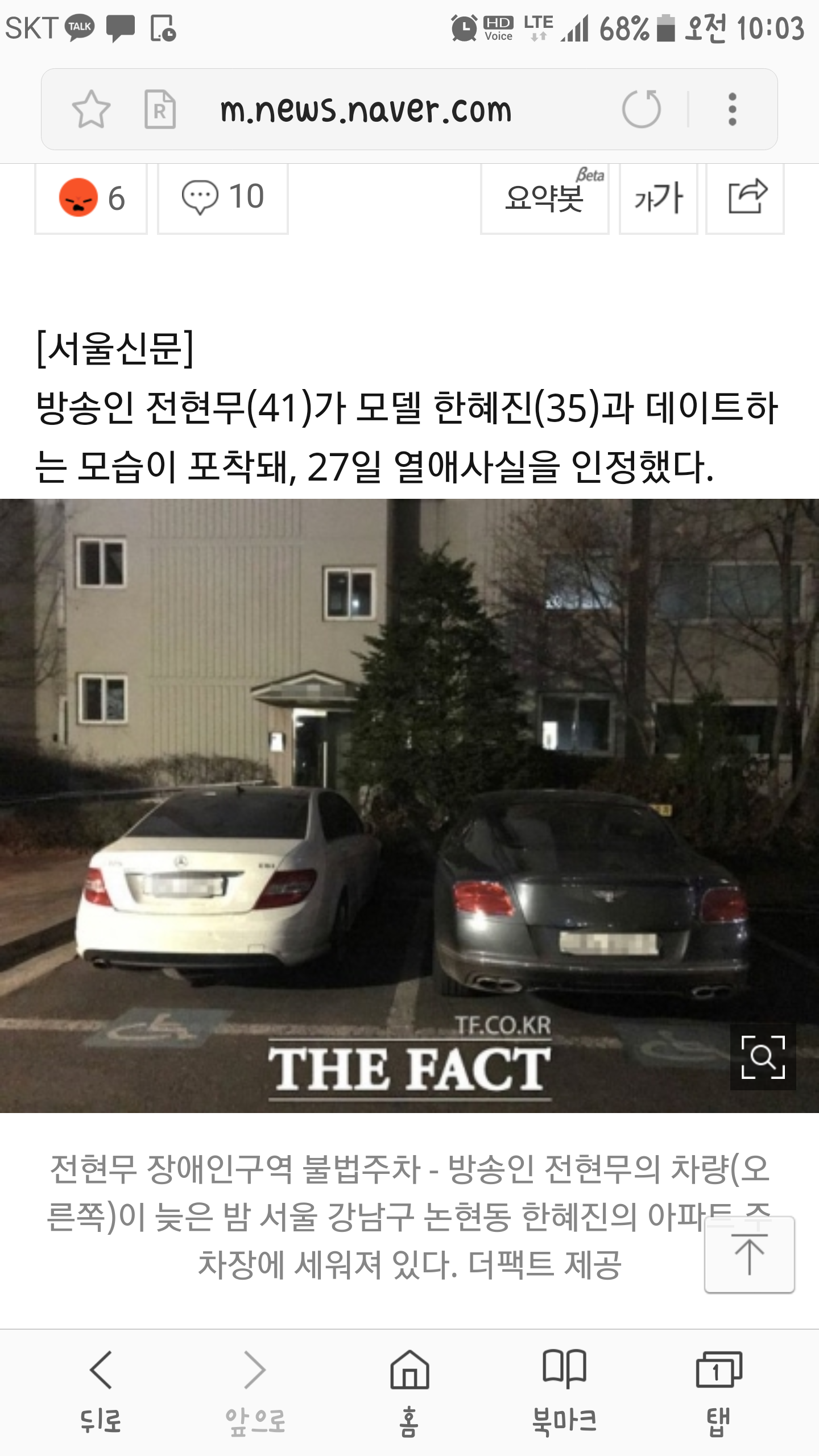 한혜진 좋아하는 편이고 전현무씨도 싫어할 정도는 아니지만...장애인 주차장에 너무 당당한 주차는...ㅎ......벌금정도야..같은 느낌인건가;;; 근데 주변에 문제제기한 사람들을 불편러들이라고 비아냥 대는.사람도 있네요;;