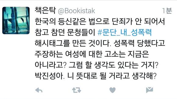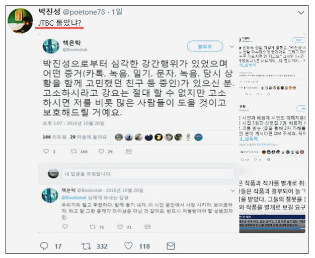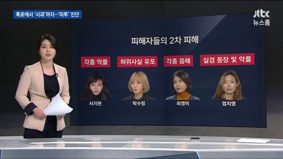 - "이때 상처가 오래 남아서 몇 번이나 자살기도를 했었어요. (그런데 지금도) 트위터에서 저를 비방하고, 모욕하고 거기다가 미투 태그까지 달고 있는데 이건 정말 미투에 대한 모독…."