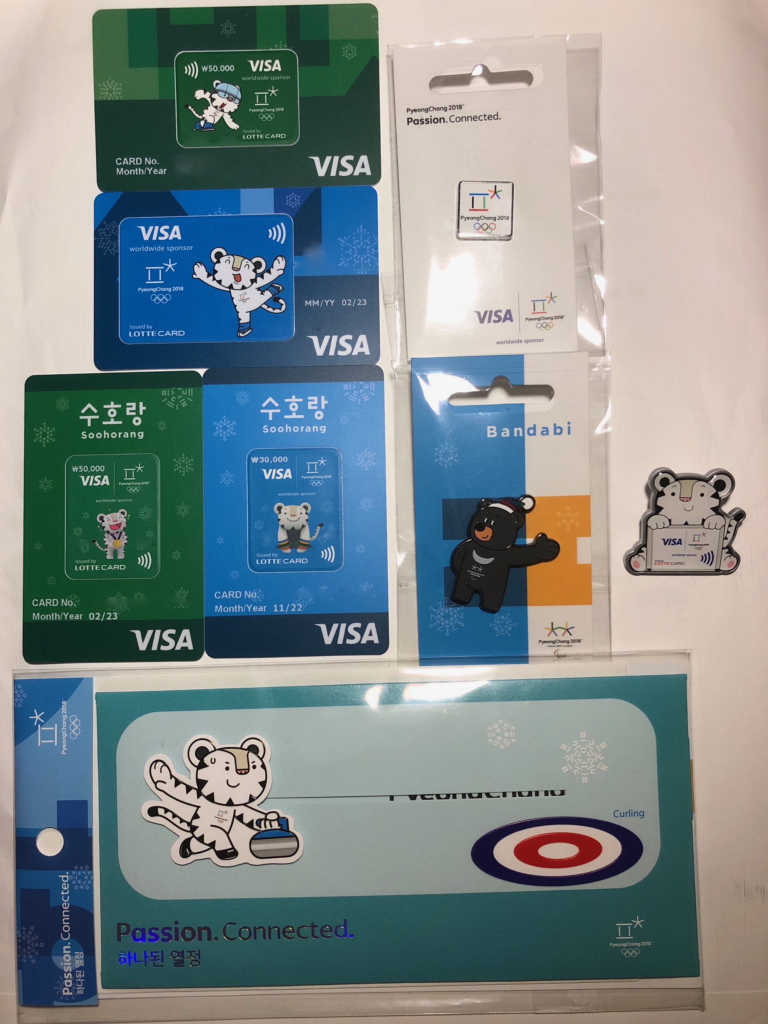 컬링 경기 전에 구매한 반다비 & 평창 동계 올림픽 뱃지, 수호랑 컬링카드입니다.