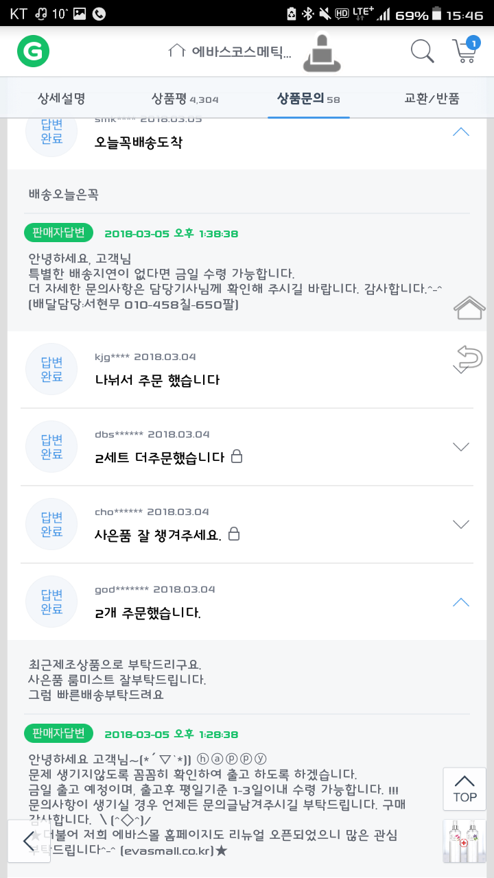주문건에대해 오늘 배송한다고 답변달려있고 ㅡ.ㅡㅋ