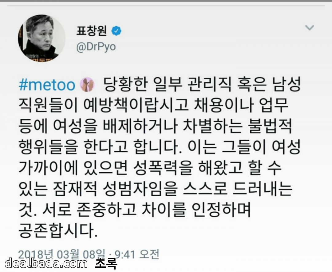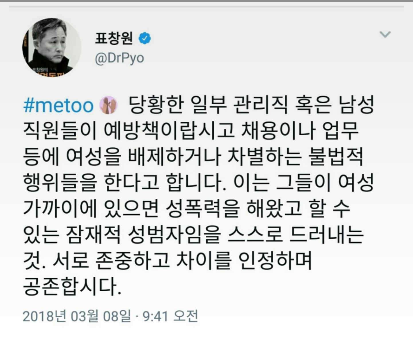 남성들이 업무에 여성을 배제한다.. 저도 표창원씨 좋아하지만 펜스룰 언급 맞는것같은데요